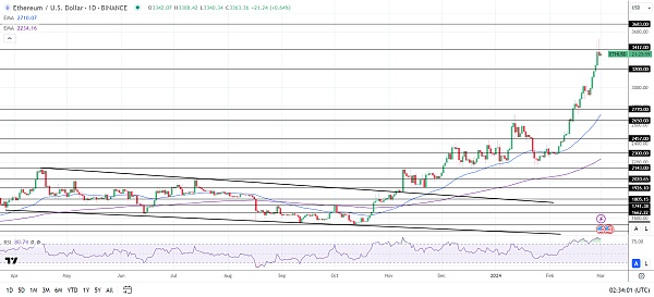 14周期每日RSI为68.22,表明以太币可能会突破3412美元阻力位,然后重新进入超买区域。