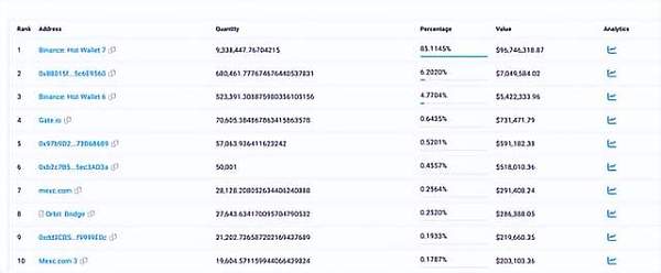 ACE代币主要分布在BSC链与Endurance主网上,BscScan当前可追踪代币数10,971,626枚,其中币安地址占比约90%,持币第二大地址0x880持有约6.2%的代币。