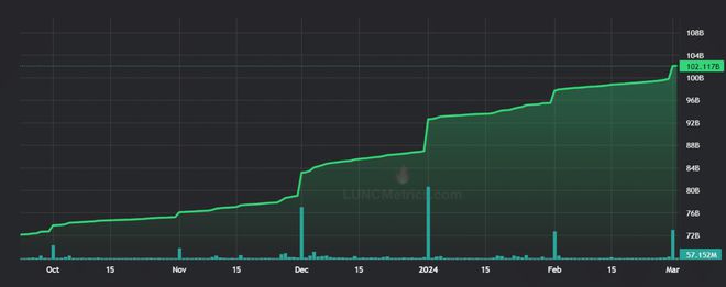 LUNC代币流通供应量为5.78万亿,总供应量为6.80万亿。随着牛市的加速,LUNC社区提高效用、资金和链发展的计划将支持LUNC销毁率的上升。