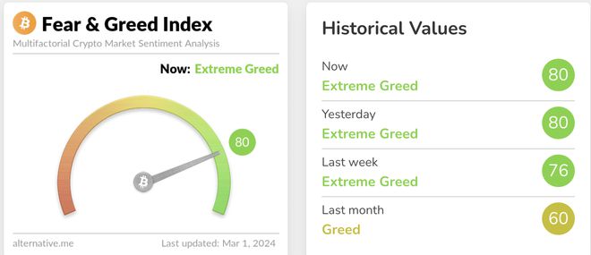 受 FOMO 情绪大幅上涨的影响,BTC 周五稳定在 62,000 美元上方。根据加密货币恐惧与贪婪指数,投资者现在的极度贪婪程度为 80,而上个月的贪婪程度为 60。