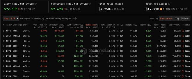 自美国证券交易委员会 (SEC) 1 月份批准比特币 ETF以来,截至 2 月 29 日,交换性总净流入达到 74.9 亿美元,凸显了投资者(尤其是机构投资者)的巨大兴趣。