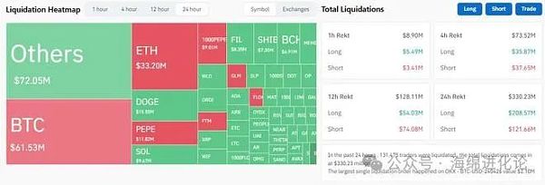 比特币再次突破64000美元之际,据CoinGlass数据显示,过去24小时,加密货币全网爆仓金额超过3.30亿美元,有超13.1万人遭清算。