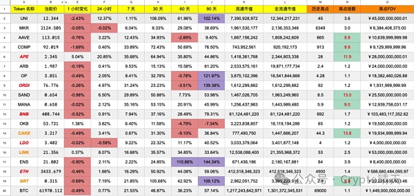 首先我们去观察一下主流币,比如 uni、ape、sand 等代币和上轮牛市高点还有 10 倍的空间,就说明目前阶段是 BTC、ETH 的牛市。