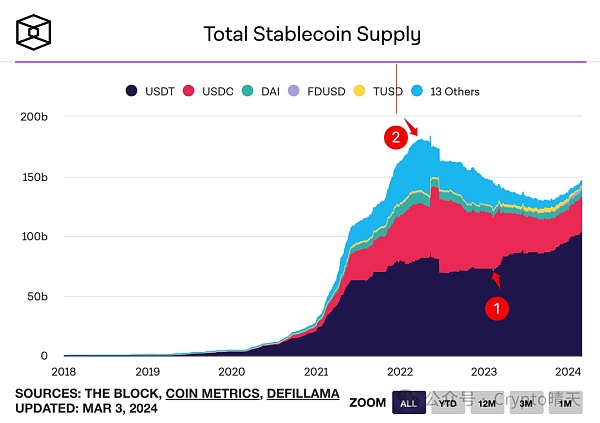 如果看 USDT 的市值,你会发现最低点在 2023 年 2 月 10 号 但是如果看稳定币总市值他一直在阴跌,直到 2023 年 10 月 12 日那为什么 USDT 在 2 月 10 号后会暴涨呢?