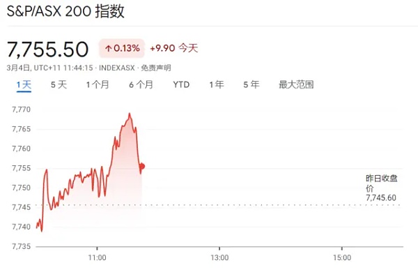 澳大利亚S&P/ASX 200周一盘初上涨0.13%,该指数上周五触及历史收盘高点7745.6 点。