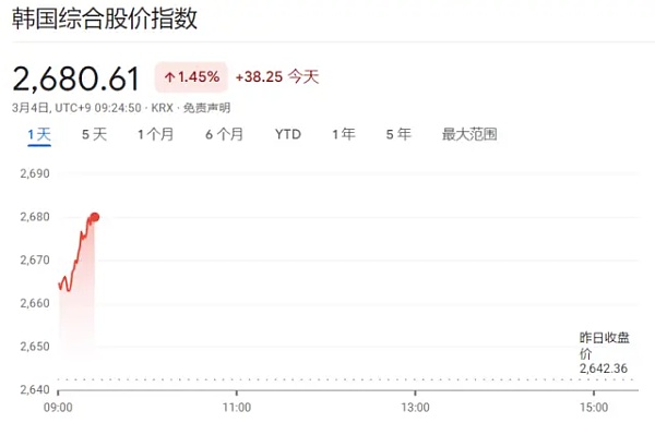 韩国Kospi指数上涨1.43%,小盘股科斯达克指数上涨1.4%。