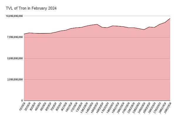 报告显示,2024年2月,波场TRON交易笔数超1.29亿,新增账户数近530万。