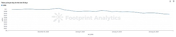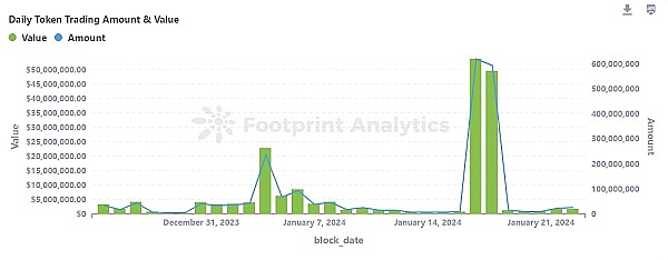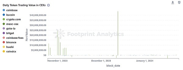 Footprint Analytics 对 CRO 的交易数据分析显示,该代币日均交易额约为 629 万美元。然而,在特定日期,例如 2024 年 1 月 4 日、17 日和 18 日,交易价值大幅飙升,高达 5,383 万美元。与这些峰值相比,大多数日子的交易价值要低得多,通常约为 176 万美元。这个市场波动很大。偶尔的交易激增表明兴趣突然增加或有大宗交易。