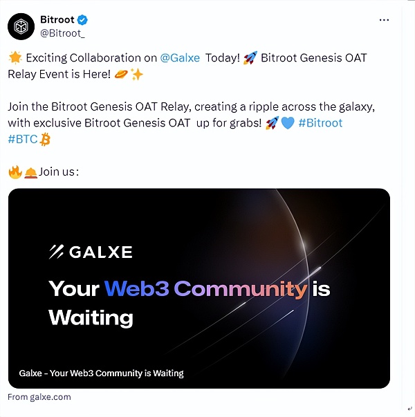 据Bitroot官方推特公布今日将开始在Galxe进行OAT活动
