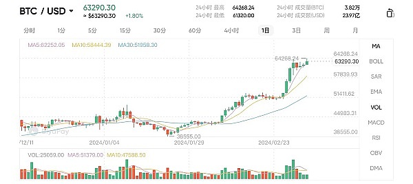 今天,加密货币进入了新的一周。在周末持续的横盘休息之后,在首个工作日比特币小幅上涨,比特币刚刚站上了64000美元随后,价格有了一些回落,但比特币价格的强劲势头一直没有停止,也许即将突破历史新高69000美元。上一次比特币价格站上6万美元,发生在2021年11月,距今已有28个月。根据BiyaPay行情显示,截稿前,比特币价格在63000美元。