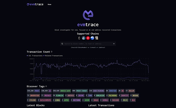 EVMtrace 提供类似 Scan 的界面,用户可以在其中查看实时交易、按加密使用进行过滤或根据标签查找合约。
