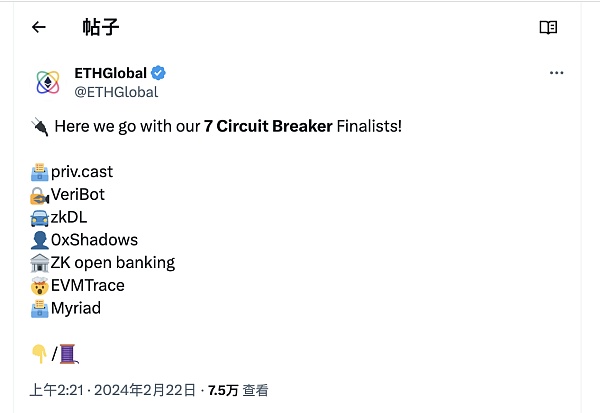 本次黑客松最终筛选出 7 个入围决赛项目。这些项目将共享 ETHGlobal 联合 Scroll、Iron Fish、Aztec、Sindri、PSE、Avail 等 6 家项目提供的 5 万美元奖金。