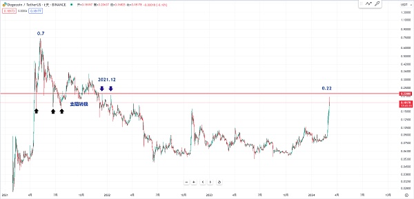 或者是后面狗狗币在2021年12月份左右这两个高点 他这边是有一个非常重要的支阻转换的位置 大约是在0.22附近 这个位置有一个短线的压力 所以狗狗币如果再涨上去 大约在0.2或者是0.22附近大家就先暂停追多 有可能在这个位置会不会震荡