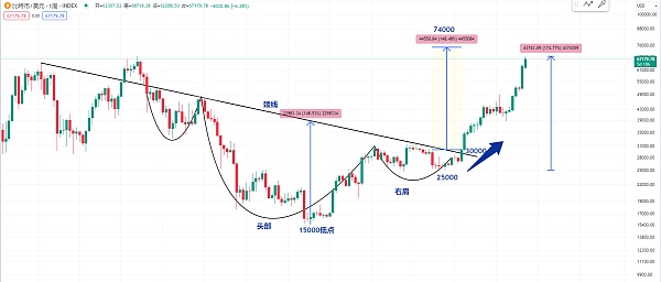 那我们同样可以用这个形态来测量距离 从15000低点的位置开始计算到这个颈线的位置 然后从这边30000的位置开始计算 如果突破历史新高 下一个目标有没有可能去到74000附近 当然我个人认为74000附近也不会是顶部 那么当价格涨到了74000之后 我们就可以期待比特币会不会在上半年去突破10万美元