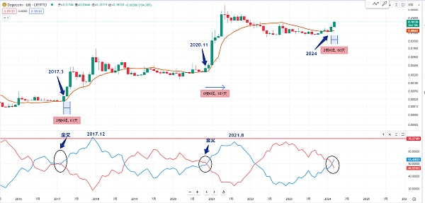 你不用去管多少 涨一倍有可能还是可以追多的 我们也可以看一下在2017年3月份这里也是大涨了三个月 那目前才涨两个月 那我们就要留意一下 如果在比较差的情况下 有没有可能会像2017年的这种上涨 或者是他后面回撤 但是狗狗币也是会继续上涨
