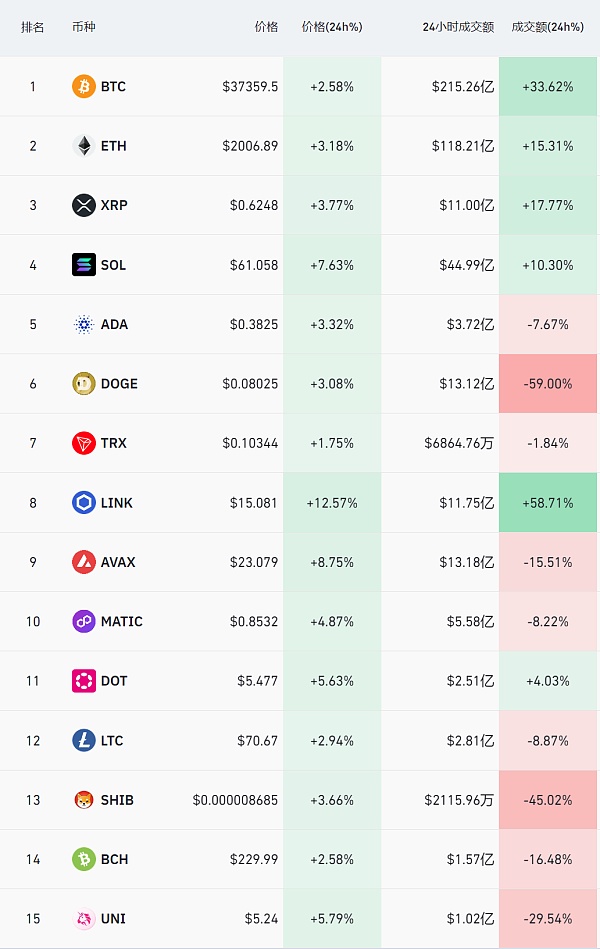2、主流币涨多跌少,SHIB上涨100.79%。加密货币总市值为2.63万亿美元,较昨日上涨5.3%;全网24小时成交量为2169亿美元,较昨日大幅拉升。
