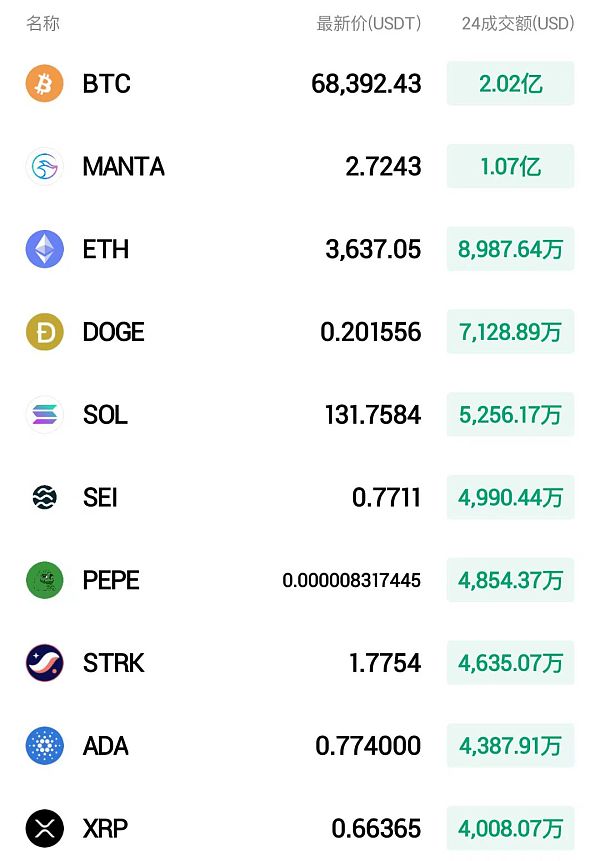 1、比特币(BTC)过去24上涨3.02%,最高报68666美元,最低报61333美元。以太坊(ETH)过去24h上涨2.32%,最高报3645美元,最低报3360美元。