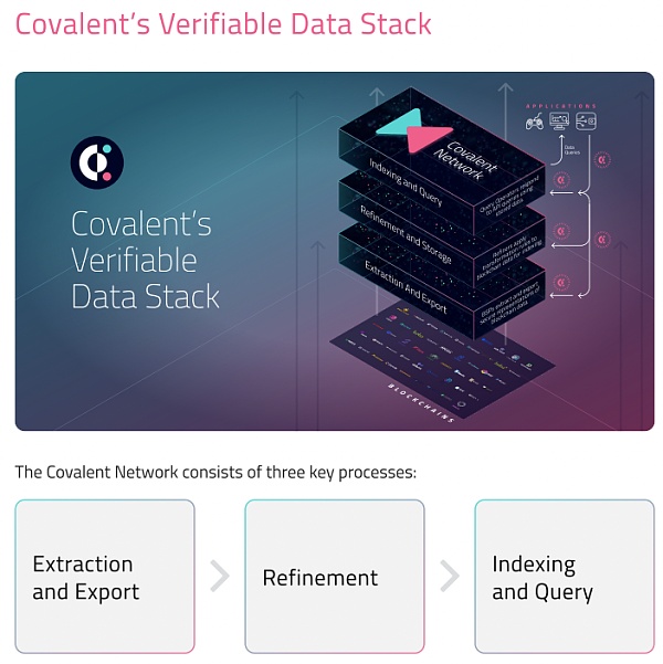 Covalent Network(CQT)的协议更为深入:它从各种区块链中提取数据,并将数据上传到存储实例,对存储的数据对象进行索引和转换,并将数据加载到API用户查询的本地数据中。简而言之,Covalent Network(CQT)基于加密安全的基础上,对所有提取的Web3区块链数据进行标准化处理,创造了一个结构化信息的储备库,为人工智能和机器学习培训提供了基础。