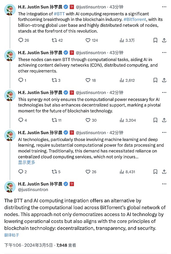此外,孙宇晨强调,AI技术,特别是涉及机器学习和深度学习的技术,需要大量的算力来进行数据处理和模型训练。传统上,这种需求需要依赖集中式云计算服务,这不仅会产生大量成本,同时还能集中控制AI的开发基础设施。BTT和AI的集成通过在BitTorrent的全球节点网络上分配计算负载提供了一种替代方案。这种方法不仅通过降低运营成本来实现AI技术的民主化,而且符合区块链技术的核心原则:去中心化、透明度和安全性。