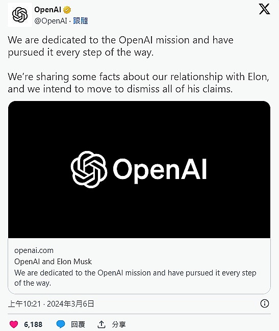 OpenAI 昨(5)日回应马斯克对其提起的诉讼,强调公司始终致力于确保AI 能造福全人类,揭露了马斯克过去试图完全控制OpenAI,以及马斯克自己也同意,实现OpenAI 的使命不必然要求AI 技术完全开源。