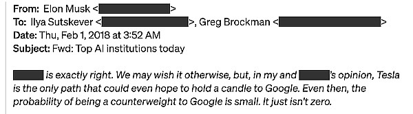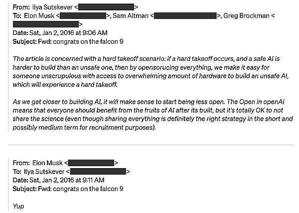 此外,OpenAI 揭露了与Musk 在2016 年的邮件对话,其中马斯克自己也明白,要实现该公司的使命不代表要开源AGI。邮件内容显示,OpenAI 前首席科学家Ilya Sutskever 向马斯克解释道: