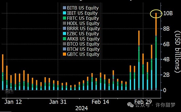兄弟们一定要有清晰的认知:牛市的每次回调都是加仓机会。今天比特币 ETF 的交易量突破了 100 亿美元,再创历史新高,比之前的记录高出 20 多亿美元,有人抛售,就有人接盘,8家ETF机构都在疯狂抄底,散户又有何惧,千金难买牛回头,珍惜盘中回撤的抄底机会。