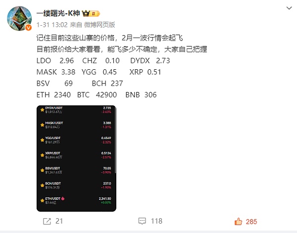 一些久远的例子我们就不一一拿出来了,但是在2024年1月31日的那个微博,我相信很多朋友都是历历在目的(下面是K神微博的原文),直接当场推密码,让一大批社区成员赚了盆满钵满(看不清点击下图可放大)