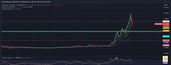 最近,狗狗币经历了显著的上涨,价格飙升至每枚0.2美元以上。然而,近期市场面临回调,导致狗狗币价格失去了峰值并跌破了EMA20趋势线。