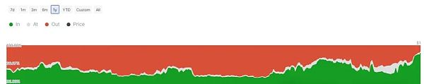 值得注意的是,价格的飙升导致了买家和卖家之间的大规模清算,进而将比特币(BTC)价格推至历史新高。据Coinglass的数据显示,仅狗狗币(DOGE)和柴犬(SHIB)的清算额就超过了7000万美元,在当前山寨币市场的涨势中处于领先地位,平均涨幅达到了100%-500%。此外,IntoTheBlock的统计数据显示,狗狗币地址的利润百分比达到了三年来的最高水平,目前为85%。