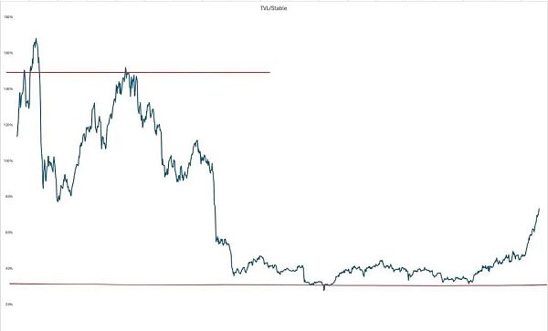 然而,这两次顶峰时,TVL/Stable比率都未超过170%(DeFi TVL与法币支持的美元稳定币市值比),第二次甚至只有148%。因此,也许当这个比率超过140%时,就进入了风险区间。这个值越高,代表着区块链的杠杆率越高,风险也越大。相反,在熊市期间,这个参数从未低于30%,当前为73%。也许可以将这个作为一个风险指标来使用:(73%-30%)/(150%-30%) = 36%。