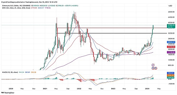 对以太坊 ETF 现货的乐观情绪日益增长是推动价格上涨的另一个因素。比特币 ETF 的批准使该产品的投资者、利益相关者和潜在运营商将注意力转向了以太坊。美国证券交易委员会 (SEC) 预计将考虑批准现货 ETH ETF,进一步激发人们对加密货币的兴趣。在突破 3,800 美元之后,以太坊价格徘徊在 3,803 美元。除了整个市场的看涨情绪外,移动平均线趋同分歧(MACD)指标上升到中性区域上方也强化了价格的上涨。20周指数移动平均线(EMA)、50周EMA和200周EMA等关键牛市指标仍在追赶上升趋势,表明涨势远未结束。