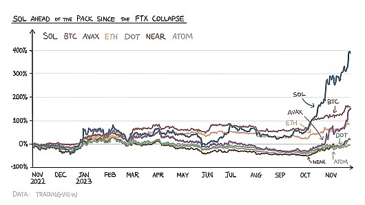 SOL 价格在几周内从 236 美元暴跌至 13 美元。投资机构建议初创公司不要选择 Solana,转而在以太坊虚拟机(EVM)上构建。随后,一些知名项目从 Solana 迁移到其他链上。然而,一年后,正如下图所示,Solana 反弹,超越了同行。