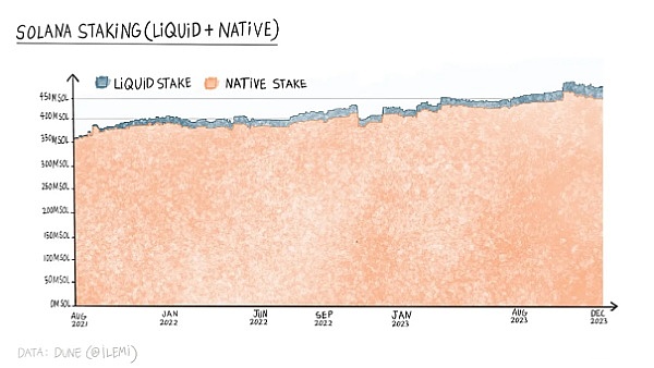Solana 的验证者们必须从一开始就质押 SOL,而以太坊直到去年才开始权益证明,但以太坊上的流动性质押行业领先。超过 3.83 亿 SOL 被质押,约占流通供应量的 90%。