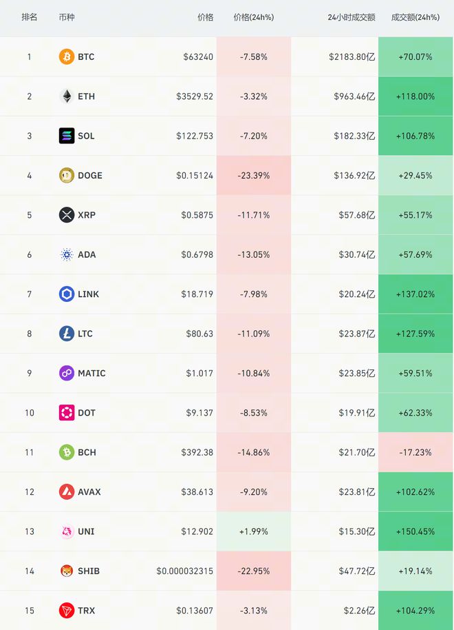 2、主流币跌多涨少,SHIB上涨100.79%。加密货币总市值为2.481万亿美元,较昨日下跌6.1%;全网24小时成交量为3241亿美元,较昨日继续拉升。