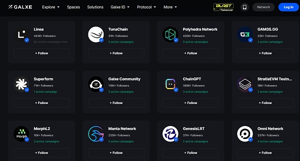 Galxe会推荐背景优秀的团队在平台上进行任务活动,比如Polygon、Optimism、Arbitrum、Linea等顶级项目方都选择在Galxe上发布自己的社区任务活动,特别是项目发展的早期对于投资者来说非常重要,这也方便投资者做项目的早期布局以获得丰厚回报。
