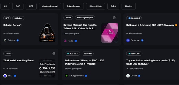 说到耕耘Web3,就不得不提Galxe。Galxe是一种无需许可的自我主权身份基础设施。在零知识证明的机制下,用户将能够安全、私密地拥有、管理和共享可验证的凭据。构建者可以使用 Galex提供的各种工具来构建 Sybil 预防算法、声誉系统、信用系统、个人数据市场、去中心化审查系统等。Galxe是目前最活跃、用户最多的Web3任务数据平台,绝大多数项目方都通过Galxe发布活动以及交互任务,同时建立自己的社区。每天都有数百万的投资者和区块链玩家访问Galxe并提交各种活动和任务数据。