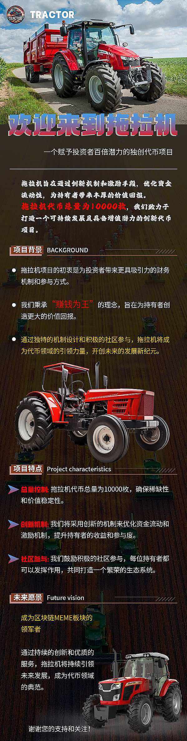 通过拖拉机项目,我们致力于为投资者打造更有吸引力的财务机制和参与方式,助力代币领域的可持续发展和增值潜力。加入我们,一起开创区块链新纪元!