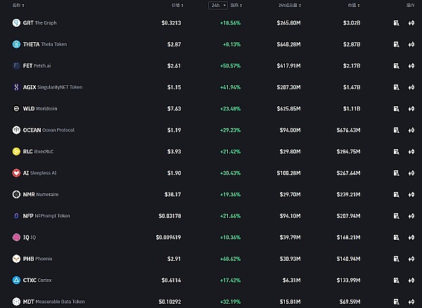 在该AI大会召开前后,AI板块经历了一周的盘整后迎来普涨,AI板块的好几个币都创新高了,特别是RNDR,FET,已经连续创新高,该板块将迎来贯穿牛市的热点板块,重点关注该板块的强势币RNDR和FET,同时也关注AI板块的其他跟风小弟:ARKM,AGIX,PHB,AR。从2月初开始,AI板块涌现了许多新项目,在短短两周内代币涨幅超过五倍,甚至数十倍。