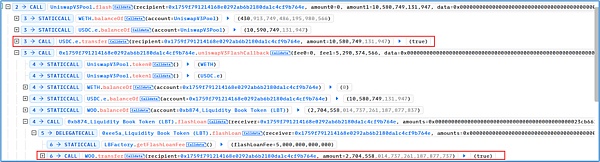 1. 以第一笔攻击交易为例,攻击合约(0x1759f791)通过闪电贷借取10580749枚USDC.e代币和2704558枚WOO代币。