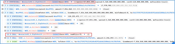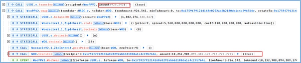 4. 攻击合约(0x1759f791)用7856868枚WOO代币在被攻击合约(0xeff23b4b)中兑换为2246892枚USDC.e,并将合约中WOO代币的价格从578535. 在价格被更改后,攻击合约(0x1759f791)仅用0.9枚USDC.e就换出了10232908枚WOO。