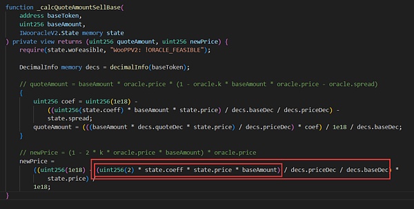 攻击的本质是合约的价格计算式中参数可以被黑客操控,导致WOO代币的价格被操纵。被攻击合约(0xeff23b4b)中_calcQuoteAmountSellBase对价格进行计算时逻辑出现漏洞。