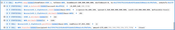 3. 攻击合约(0x1759f791)将100000枚USDC.e兑换为173684枚WOO,并略微抬高WOO的价格。