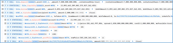 2. 后通过在Silo合约中抵押7000000枚USDC.e代币,借出了5092663枚WOO代币,再将2000000枚USDC.e代币兑换成了WETH。