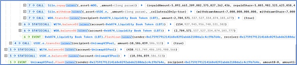6. 攻击合约(0x1759f791)归还silo中借出的WOO代币提出抵押的USDC.e代币并归还闪电贷函数,最后获利559枚ETH和2549710枚WOO