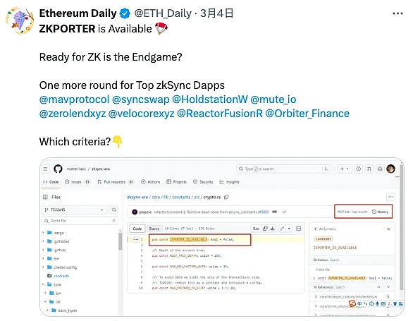 究其缘由,除了一些团队成员在社交媒体上持续不停的谜语发言之外,最大的「线索」 则是有社群成员在Matter Labs 近期更新过的Github 程式码库内发现了「zkPorter 已可用」(zkPorteris available)的字样。