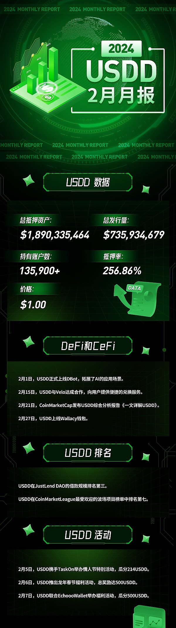 去中心化超抵押稳定币USDD月报新鲜出炉,一起来看看2024年2月USDD都有哪些亮眼表现吧。