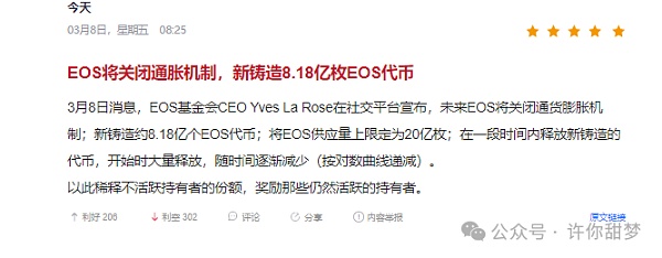 EOS将关闭通胀机制,新铸造8.18亿枚EOS代币。EOS基金会CEO Yves La Rose在社交平台宣布,未来EOS将关闭通货膨胀机制;新铸造约8.18亿个EOS代币;将EOS供应量上限定为20亿枚;在一段时间内释放新铸造的代币,开始时大量释放,随时间逐渐减少(按对数曲线递减)。