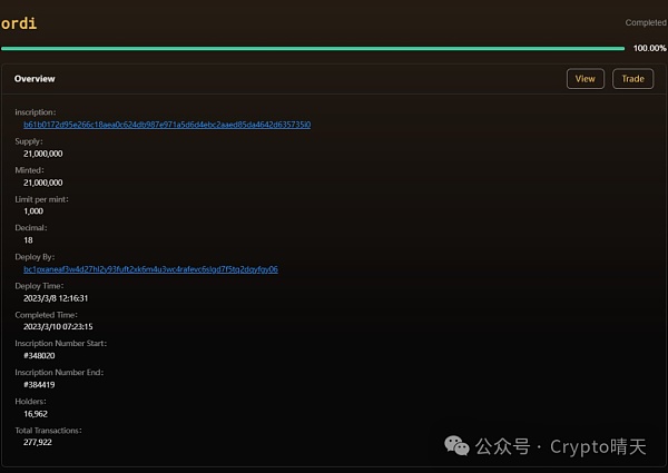 今天ORDI诞生一周年了,在2023年的今天。命运的齿轮开始转动。从不到0.002刀/枚的价格一直到最高100刀/枚,涨幅接近5万倍。
