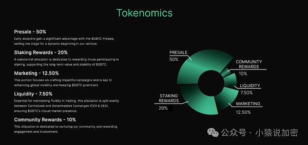 根据其网站,50% 的 GBTC 供应量专门用于预售。另外20%用于质押奖励,10%用于社区奖励,7.5%用于交换流动性,12.5%用于营销。根据比特币的核心理念,这将 100% 的 GBTC 代币交到社区手中,从而实现长期、有机的价格行为。