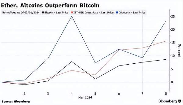像狗狗币和佩佩币(PEPE)这样的代币在周五出现了两位数的涨幅,这加剧了整个本周亮眼的行情。以市值计算的第二大加密货币以太坊本周迄今上涨约16%。